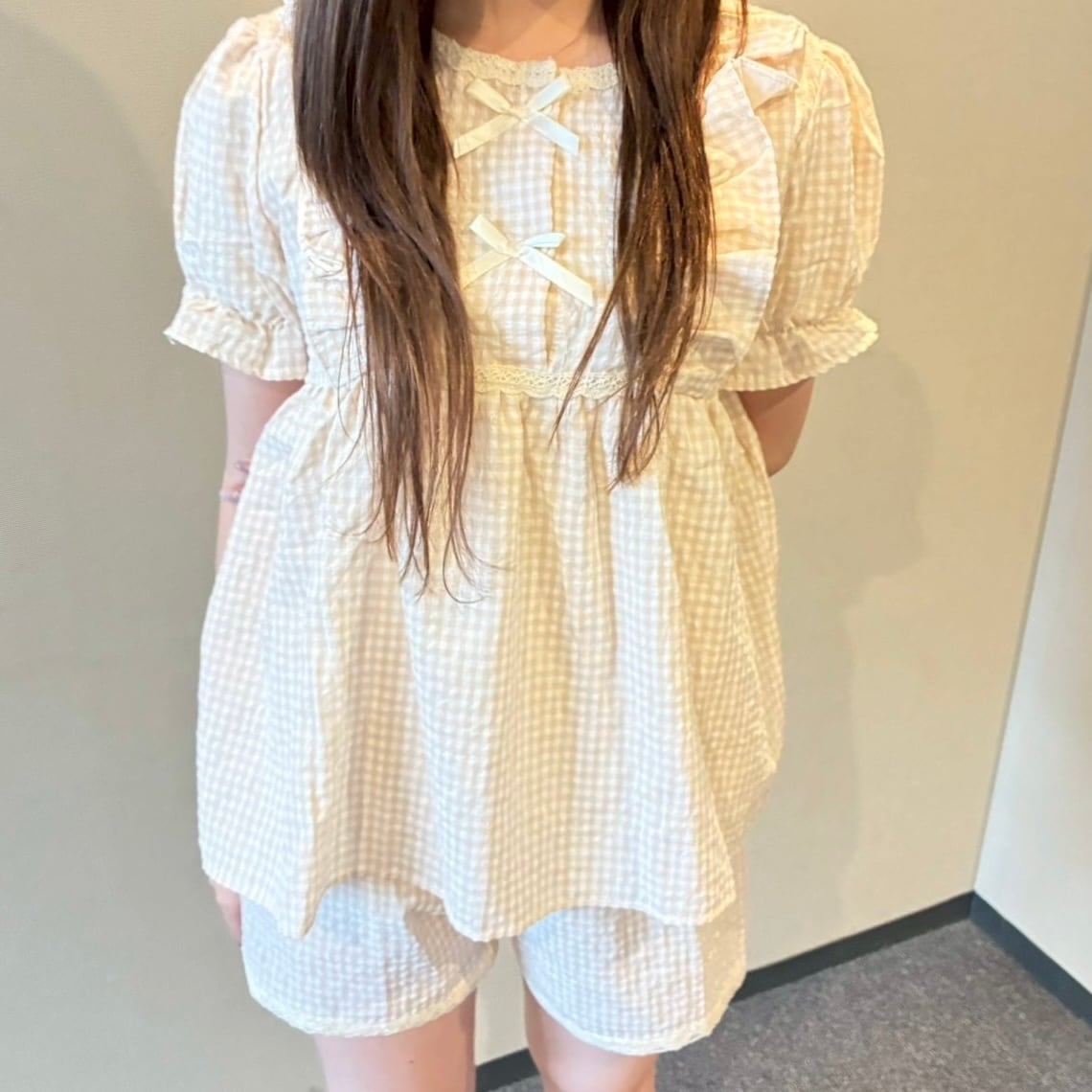 胸元にリボンやレースが付いていてシンプルなのにガーリーさもあるフェミニンな半袖トップス