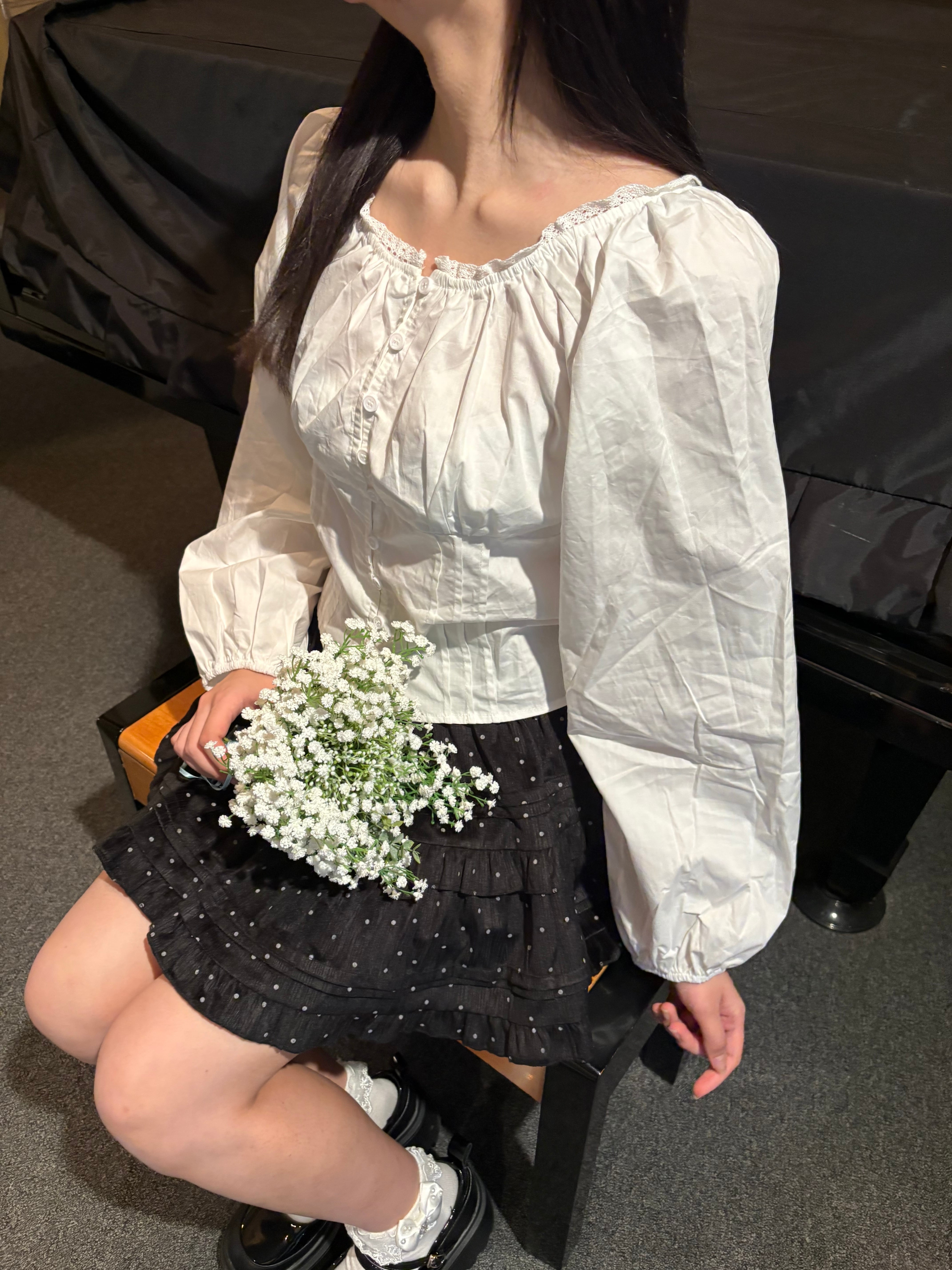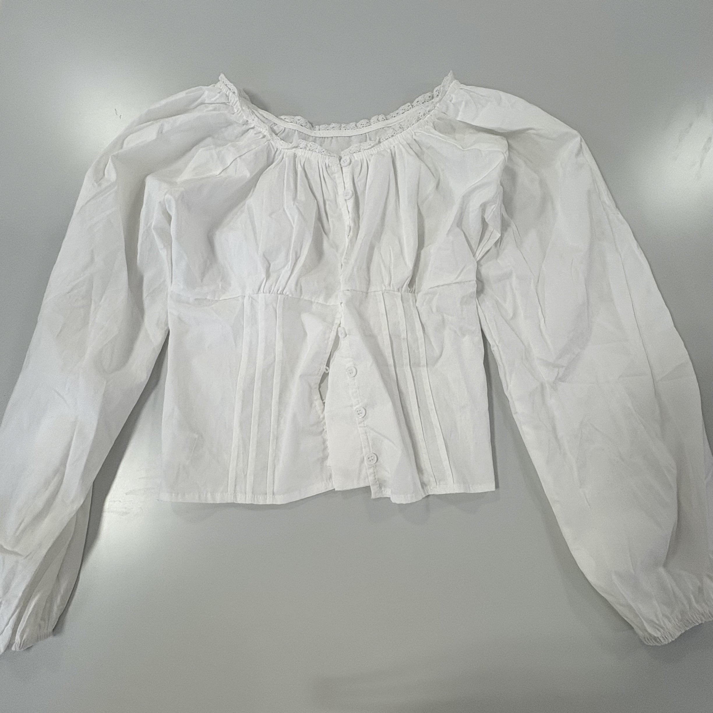 "柔らかなホワイトが肌を明るく見せてくれる、上品な長袖ブラウス.⋆ 程よいボリューム感で、シンプルながら存在感のあるデザイン♡ 春夏は一枚で、秋冬はワンピやニットとのレイヤードにもぴったり。 どんなボトムスにも合わせやすい、万能アイテムです 着丈 38cm 身幅 41cm 裄丈 78cm 身丈 40cm