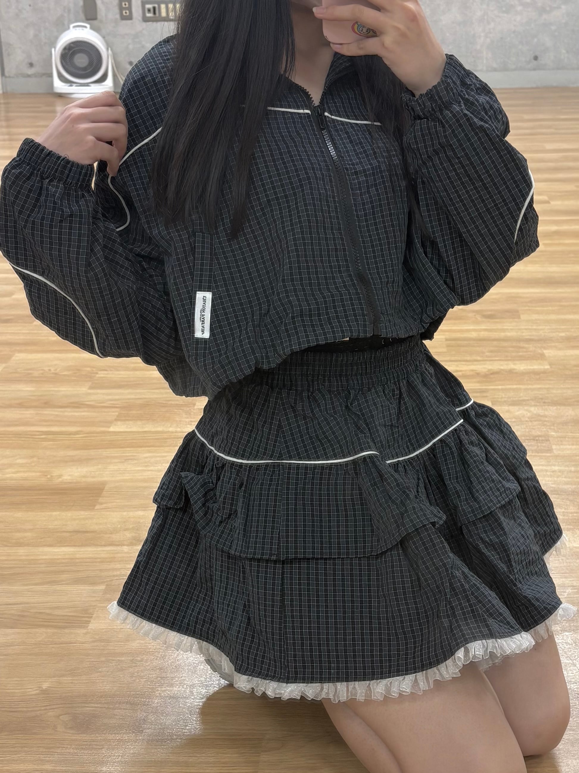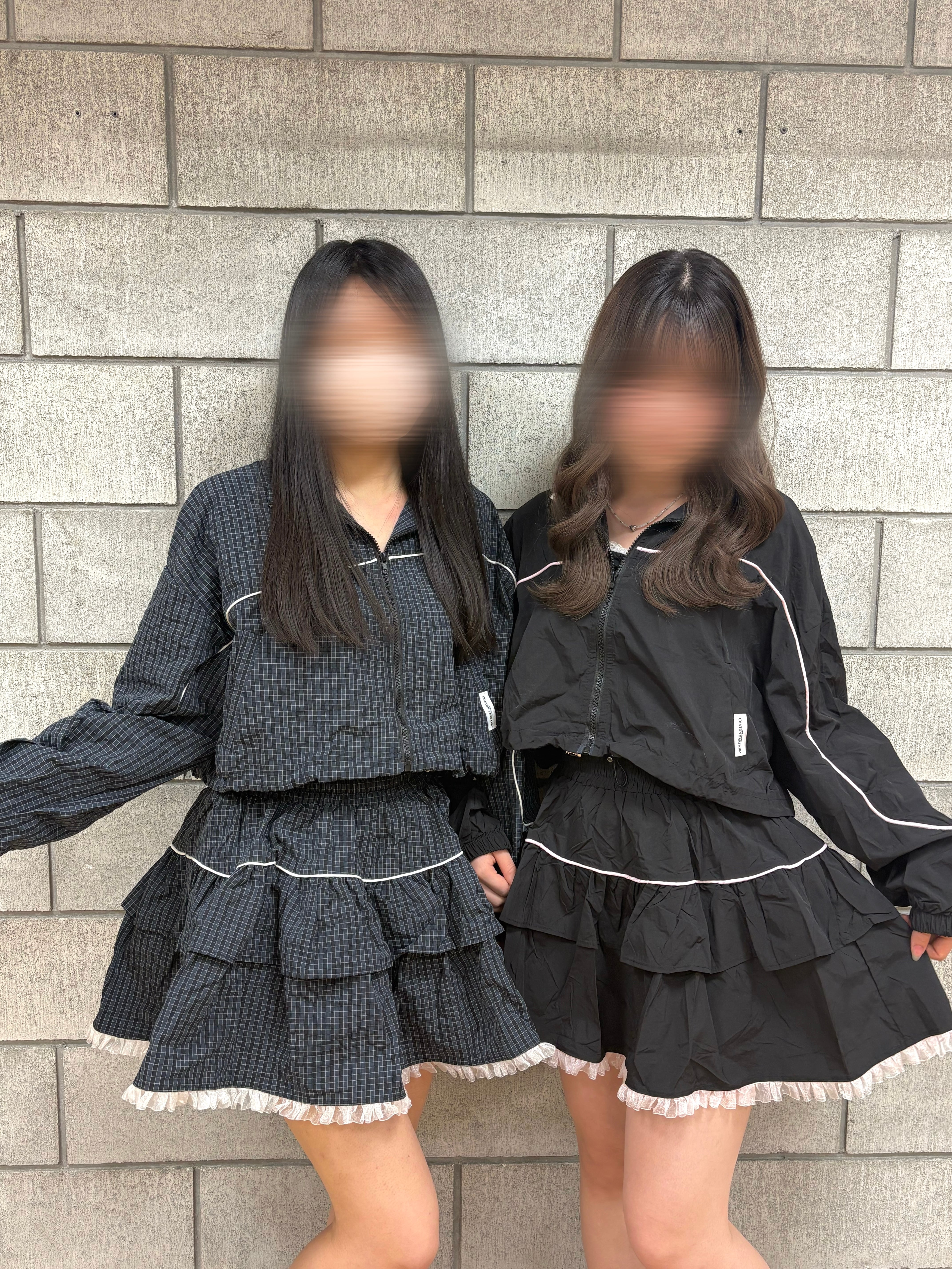 スポーティなトラックデザインに、 レースとスカートでガーリームードをMIX᧔o᧓ ピンク×ブラックで個性を、チェック×ホワイトで軽やかさを。 甘さと強さのバランスが光るスタイルアップアイテム♡ 上 着丈48cm 身幅60cm 裄丈80cm 袖丈49cm 肩幅60cm 下 ウエスト平置き 32cm 丈 37cm ヒップ78cm