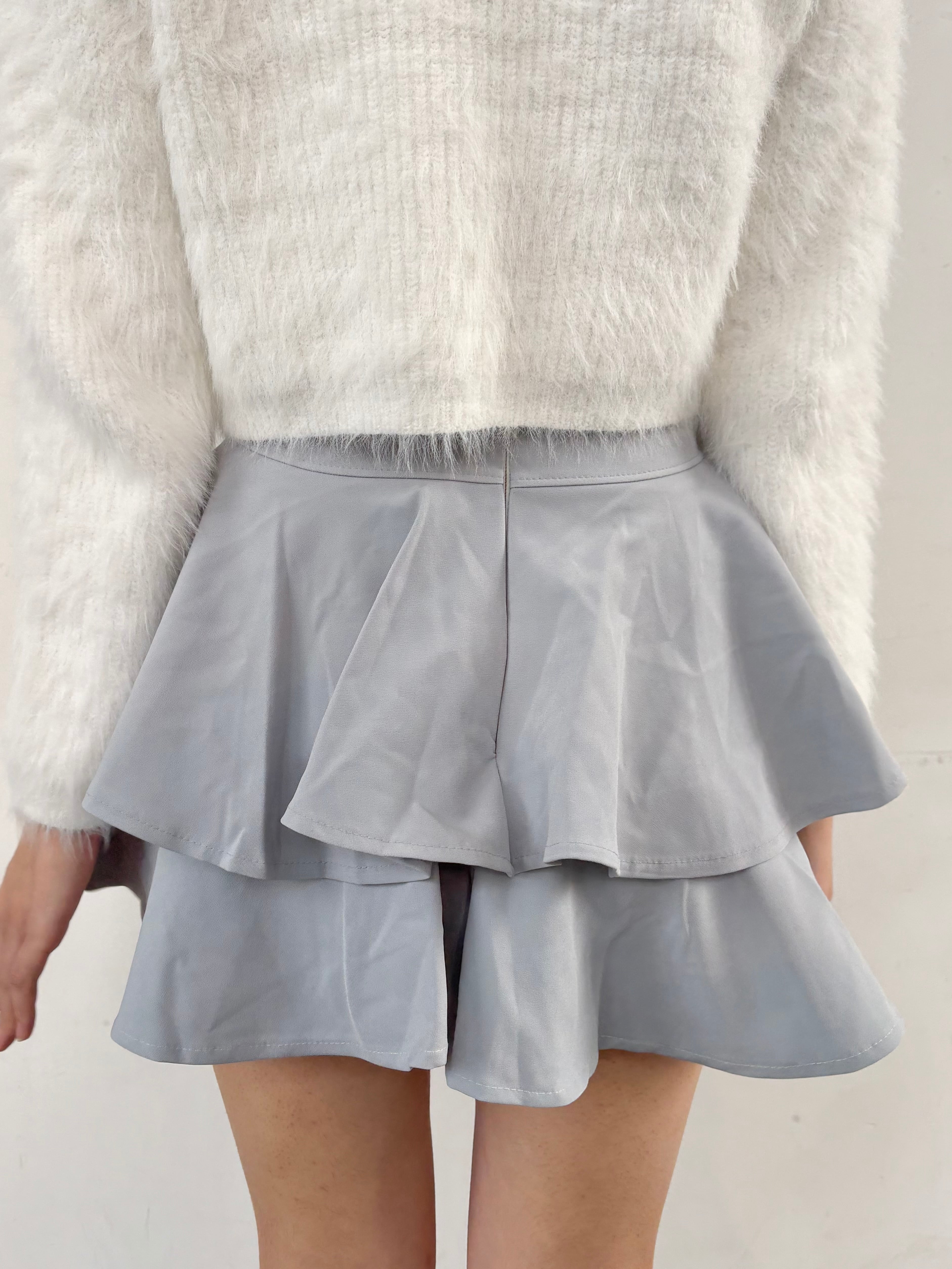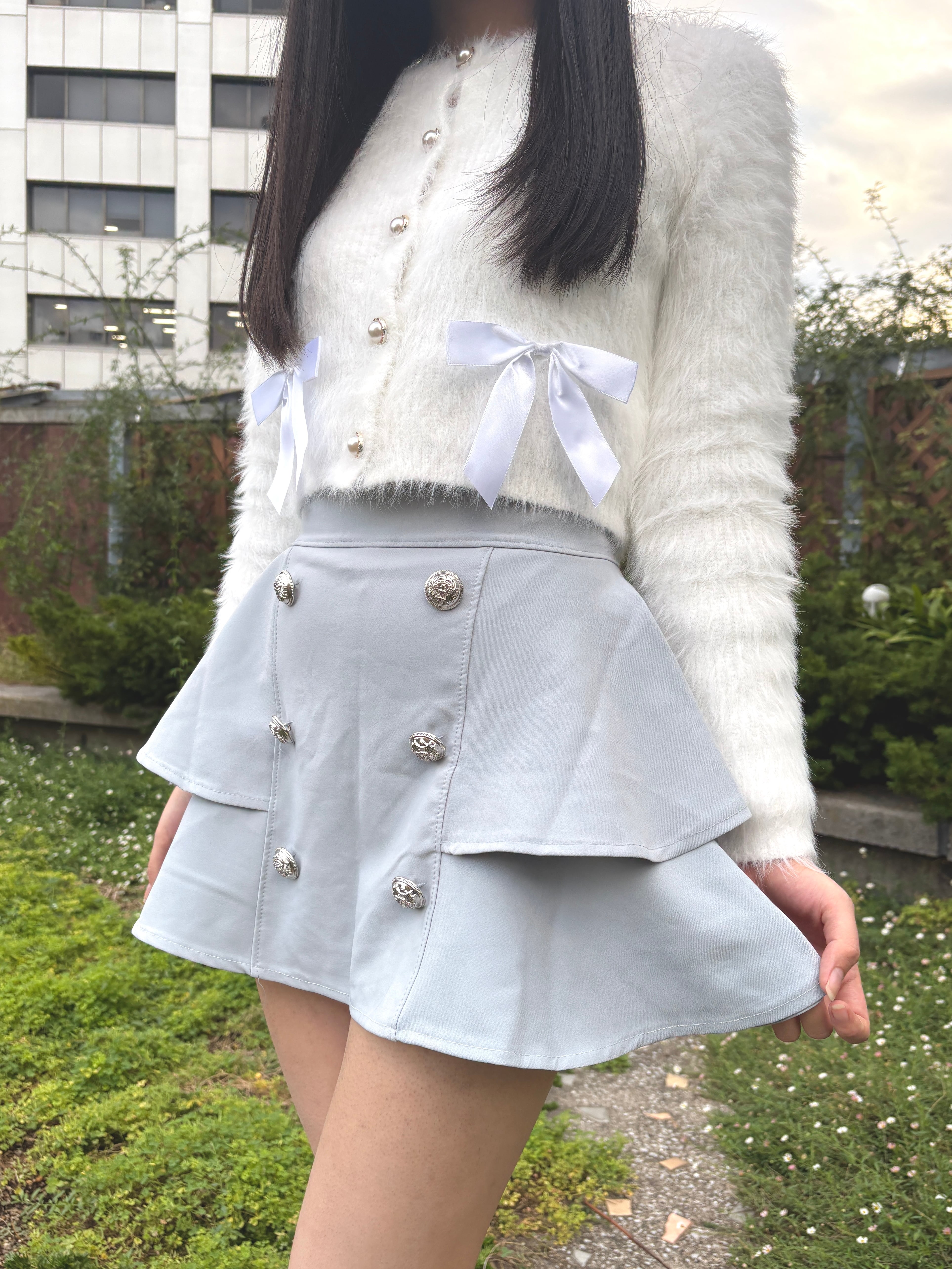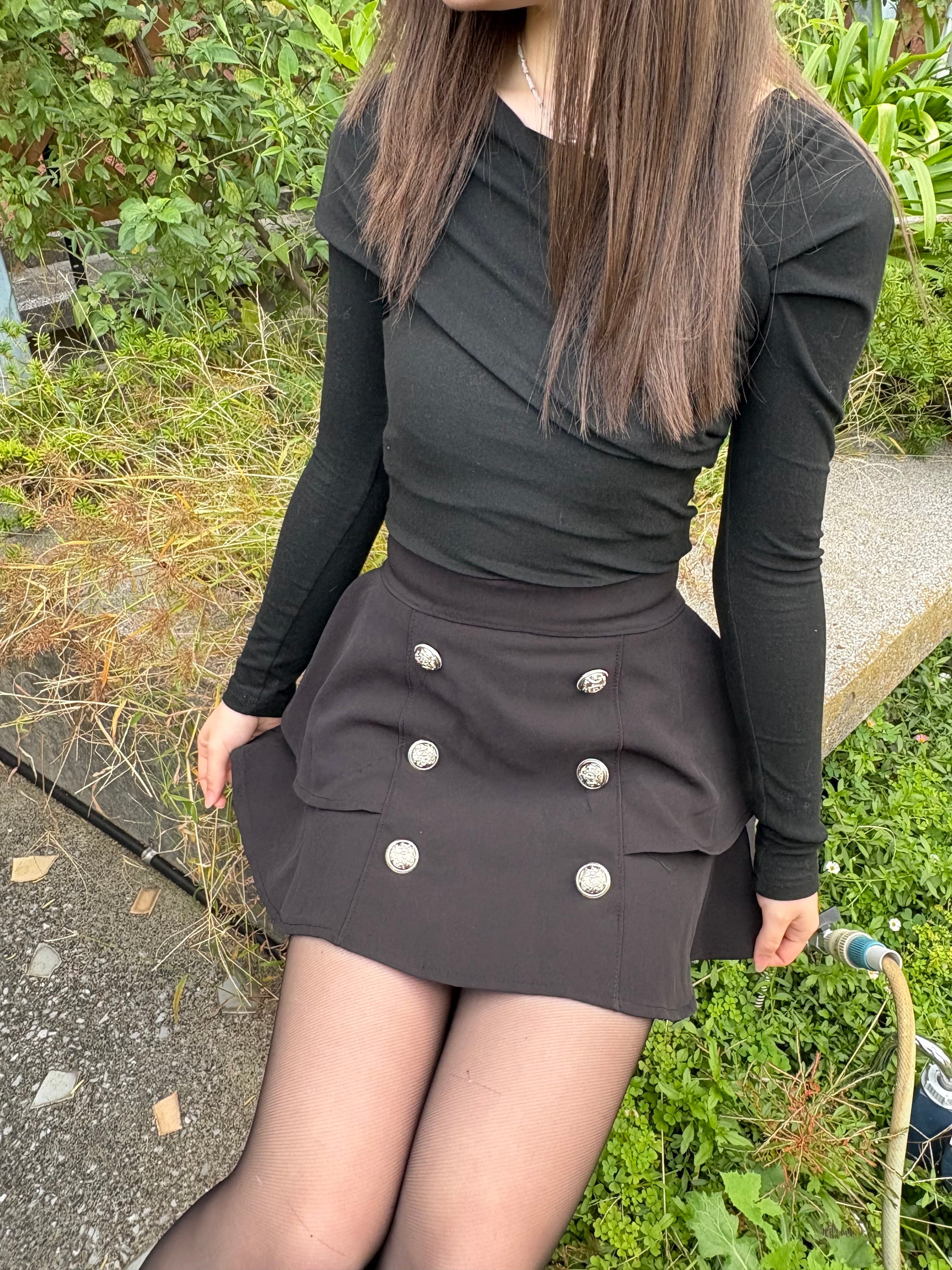 フロントに並んだ6つの大きめボタンが印象的なミニスカート♡ シンプルなデザインながら、クラシカルな雰囲気を引き立てるディテールが魅力⊹ ‧₊˚ アイスブルーは爽やかに、ブラックは上品に。 季節を問わず着回せる万能アイテムです◎ 着丈 36cm ウエスト 66cm ヒップ 82cm 裾丈 72cm