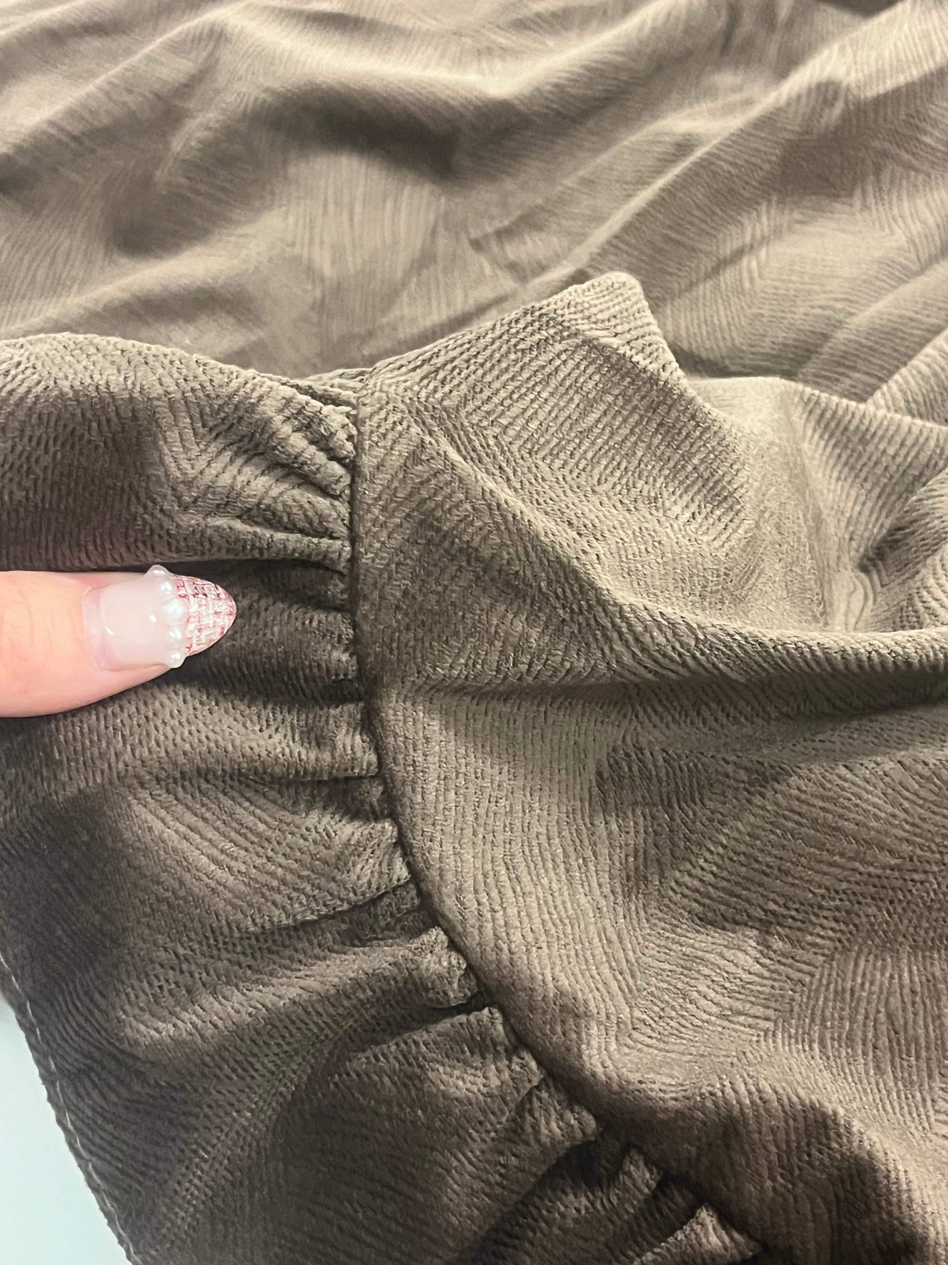 シックなブラウンの生地には、細やかなヘリンボーン柄があしらわれており、奥行きと高見えする上質な雰囲気を演出しています。