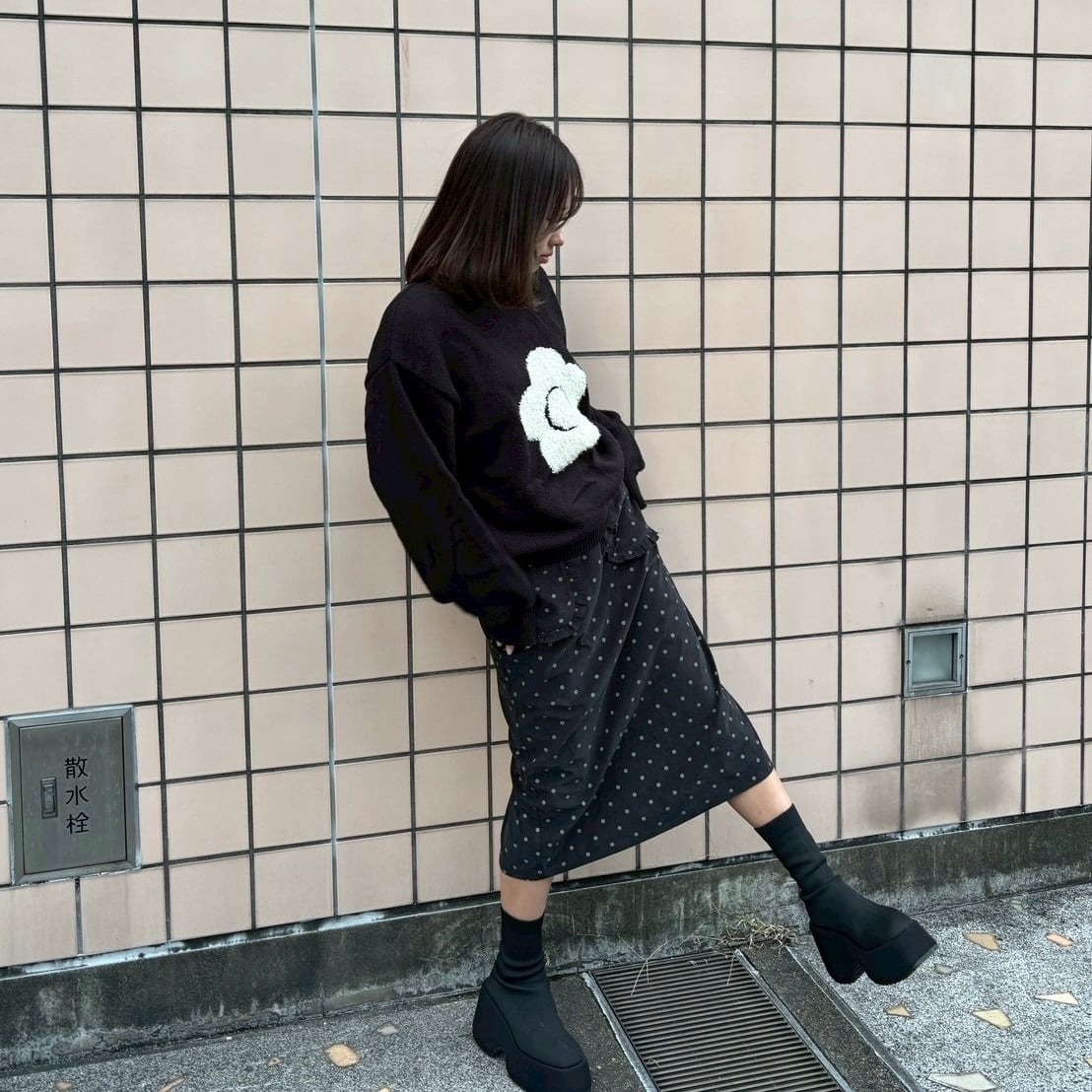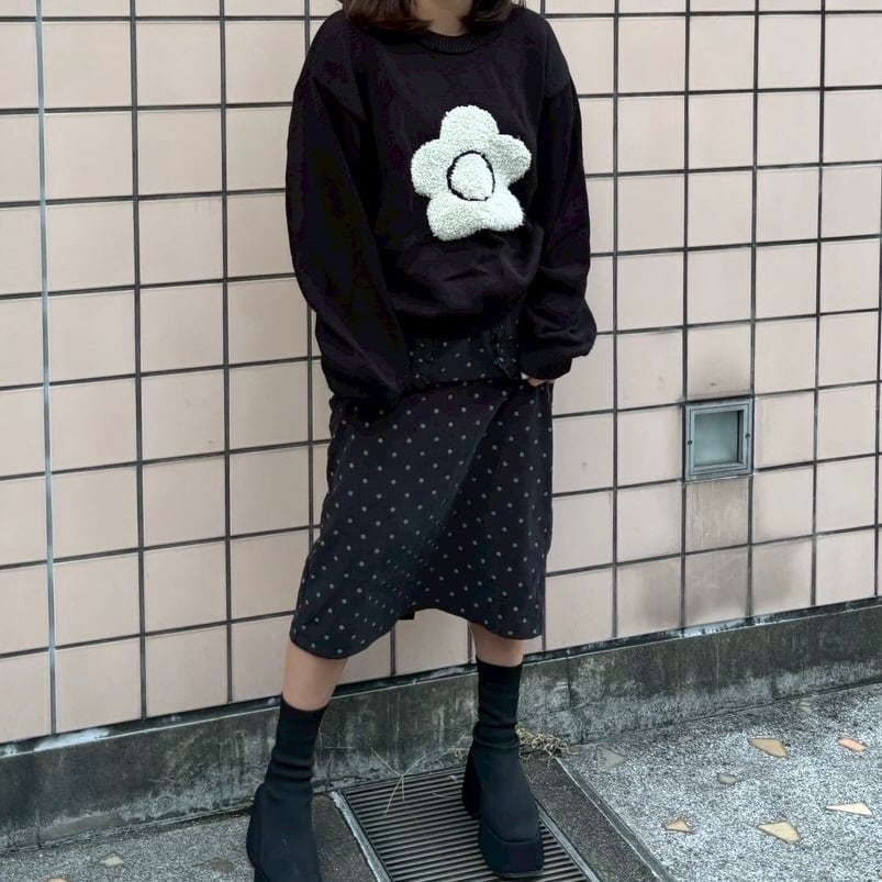流行りの水玉模様のロングスカート大きいポケットがポイントでどんな服にも合わせやすい カラー:ブラック ウエスト34cm、総丈76cm