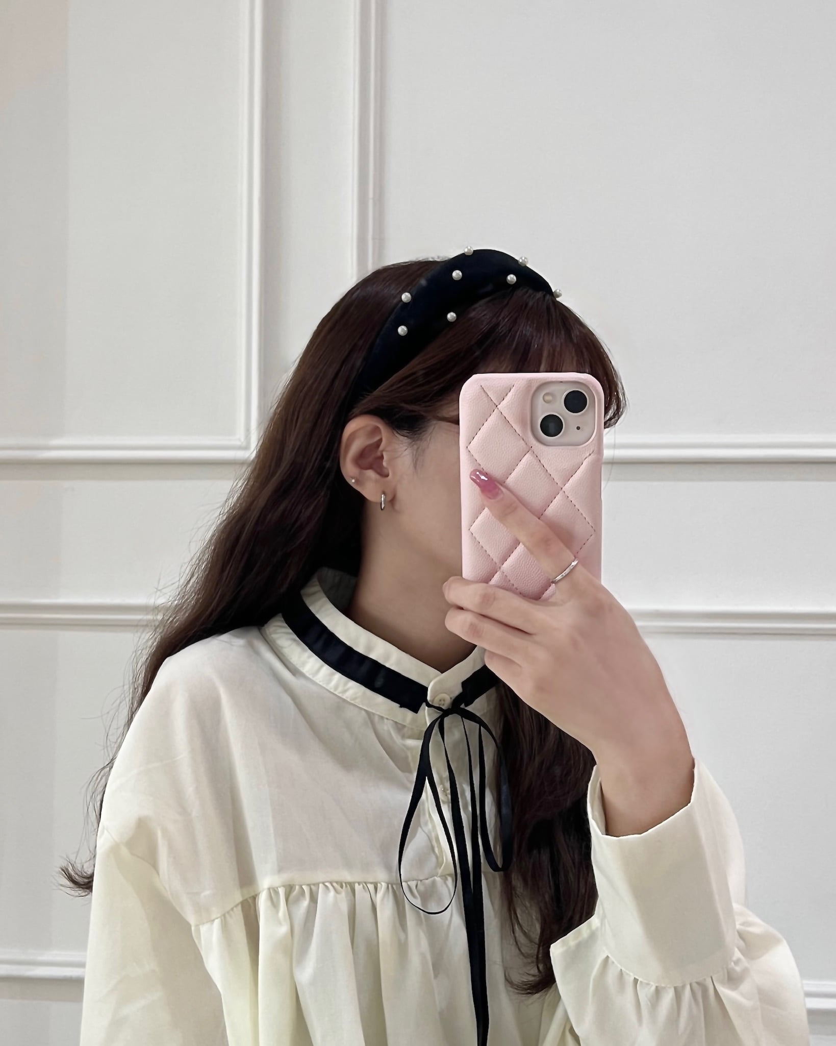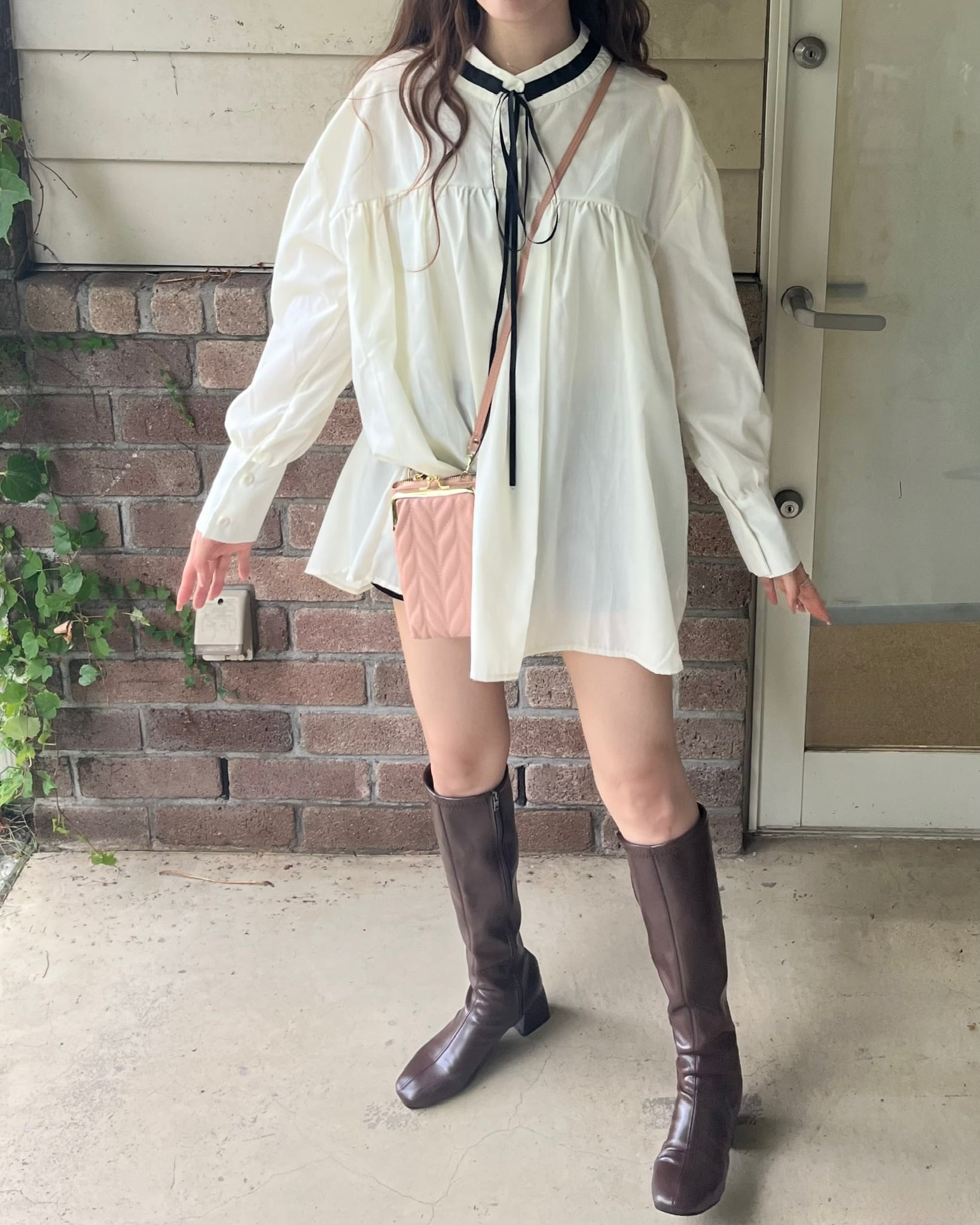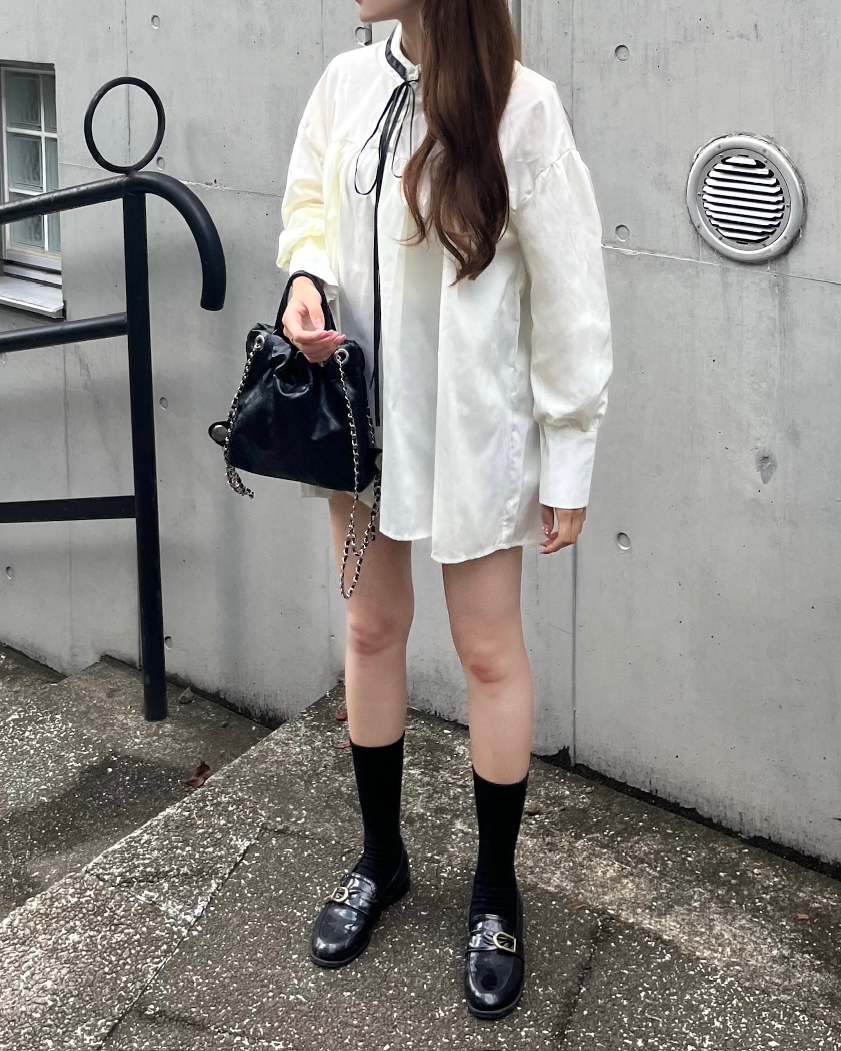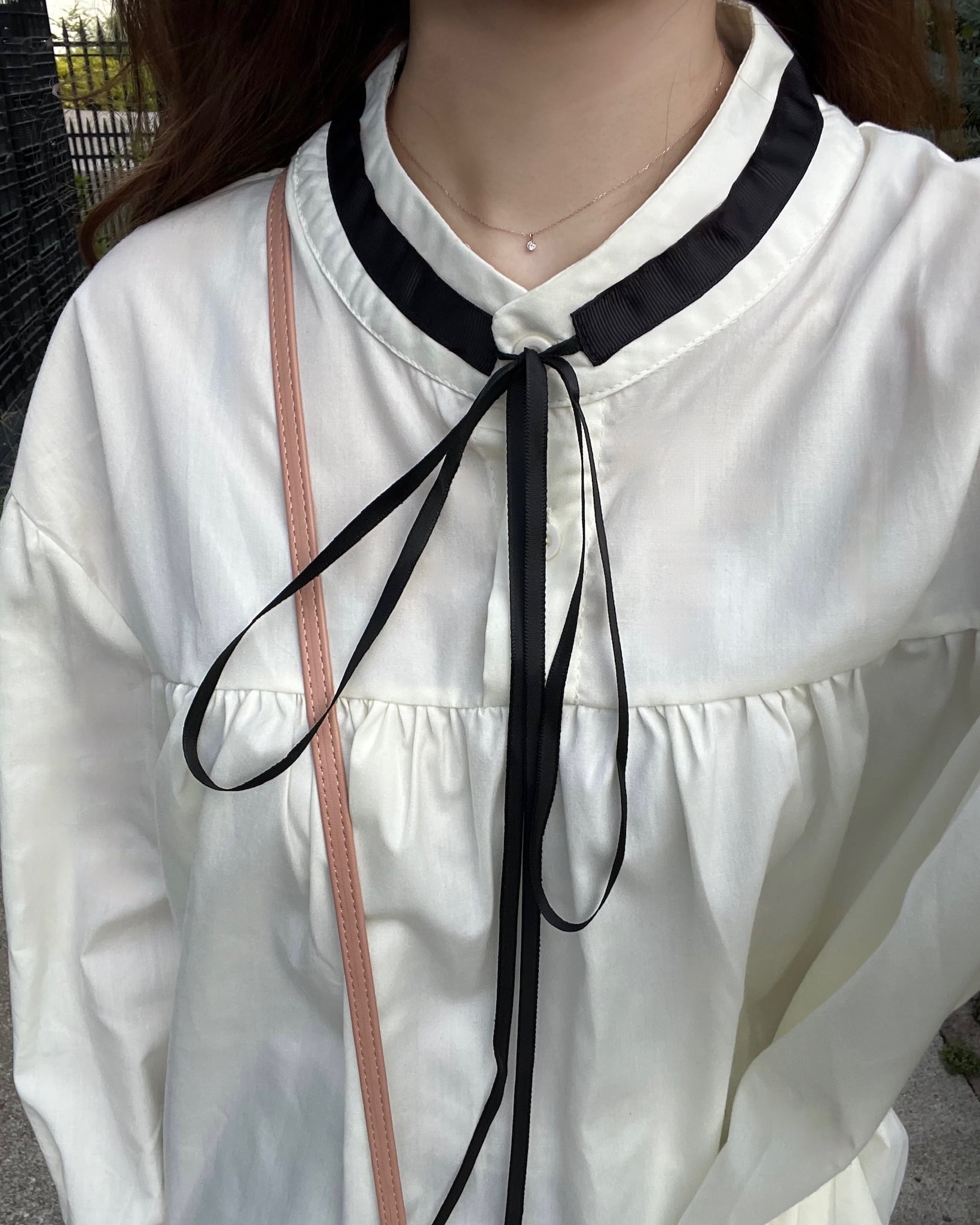・着心地抜群のゆったりシルエットですが、リボンタイに長めのカフスが上品かつ可愛らしさを演出してくれます。