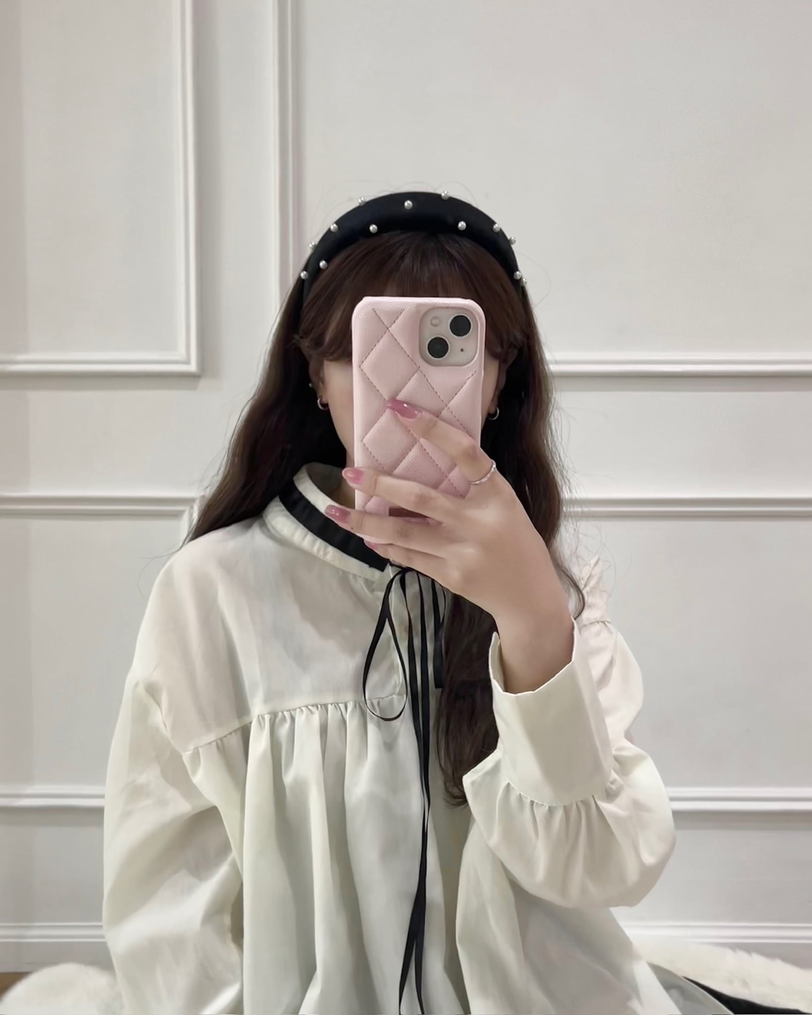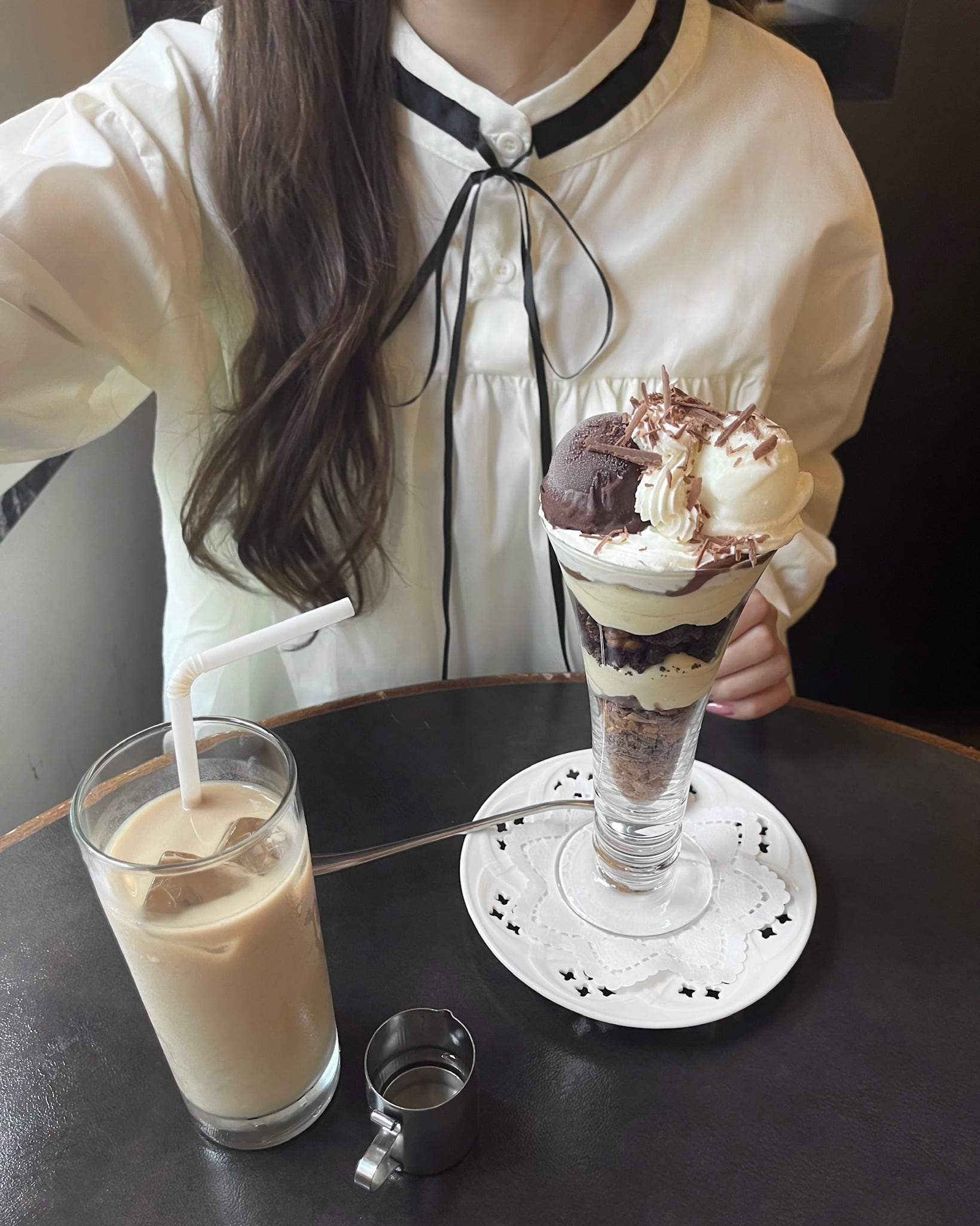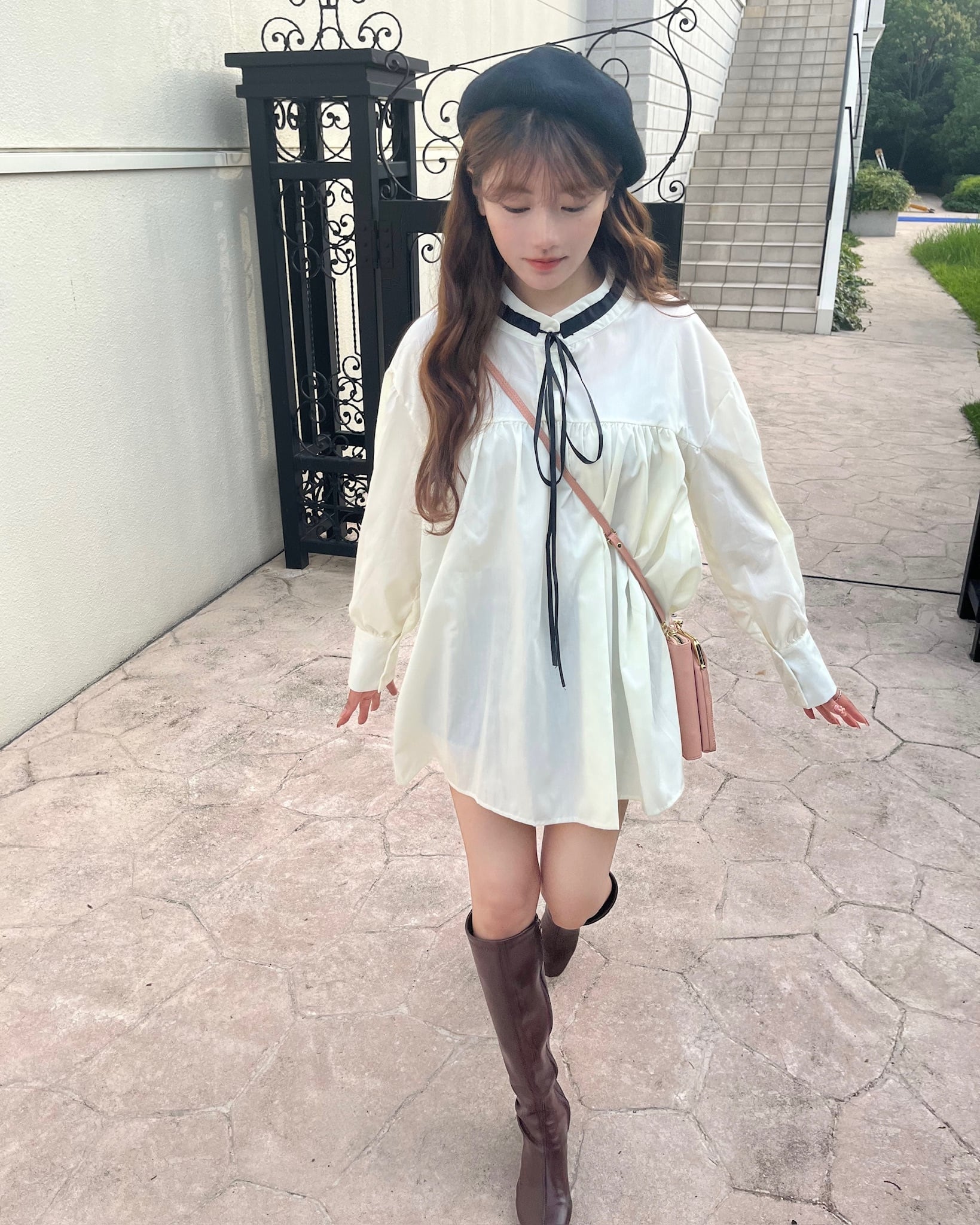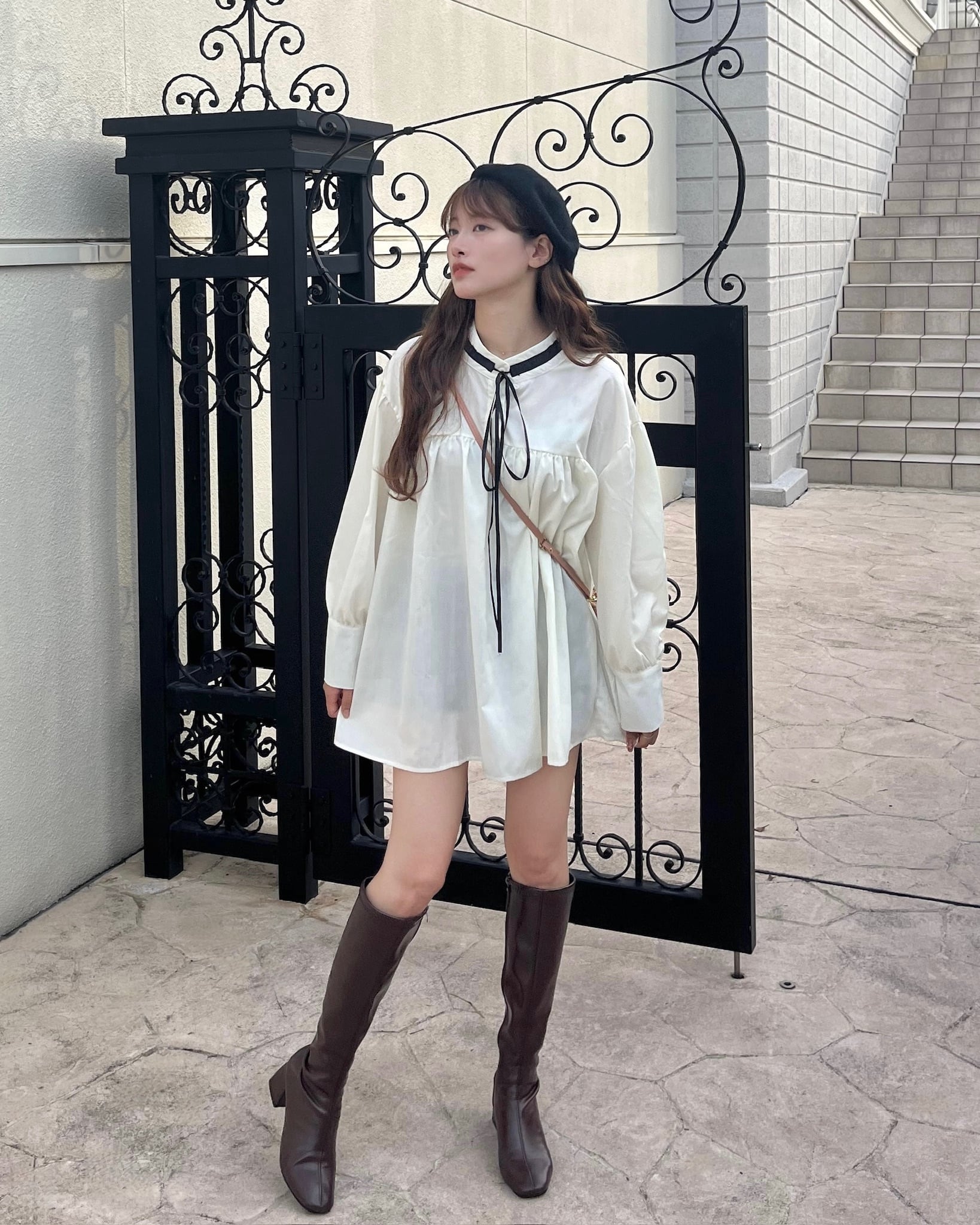 ・着心地抜群のゆったりシルエットですが、リボンタイに長めのカフスが上品かつ可愛らしさを演出してくれます。