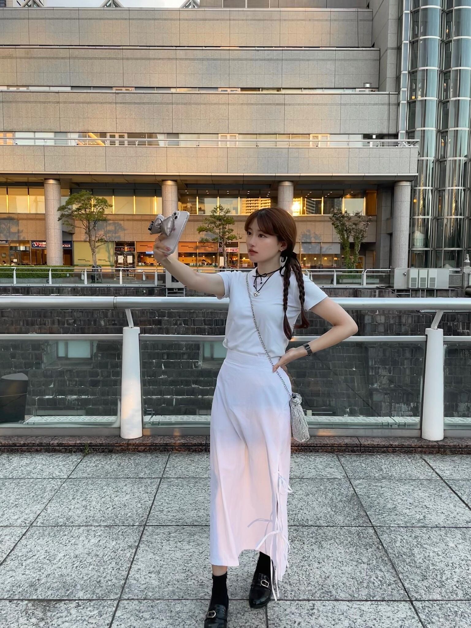 リボンがついたスリット入りロングスカート。