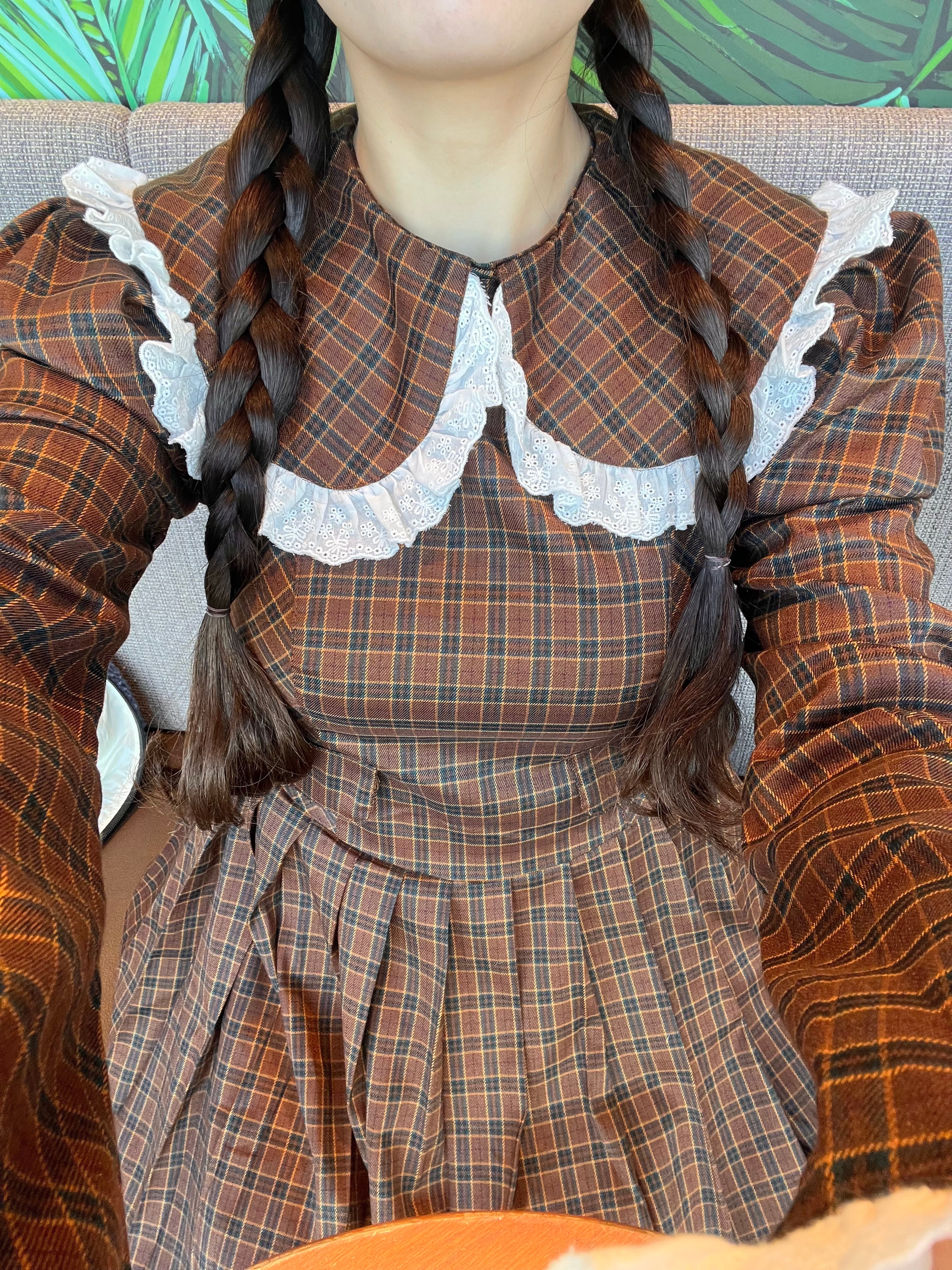 ガンクラブチェックが甘くなりすぎないビッグカラーのプリーツワンピース。