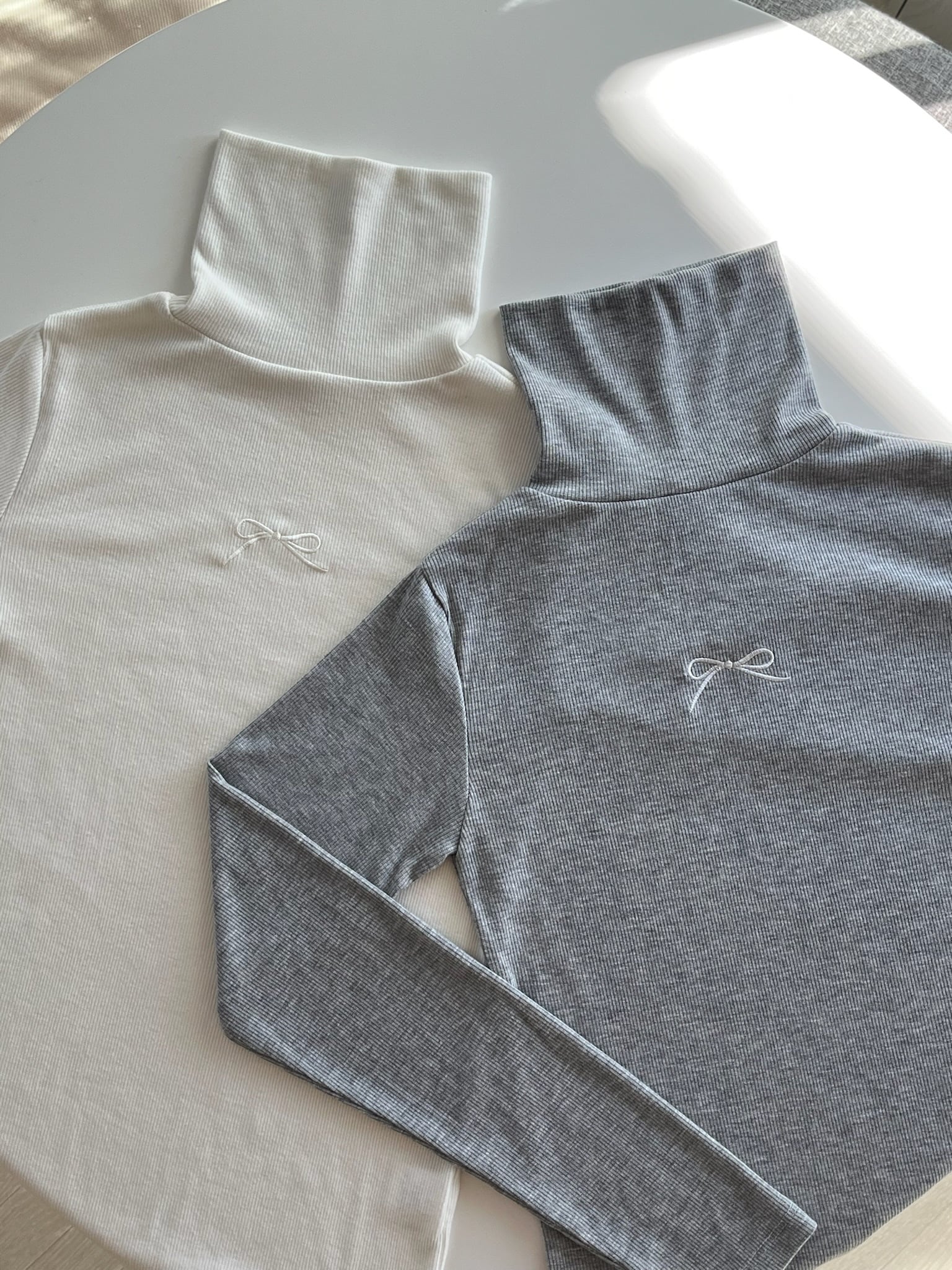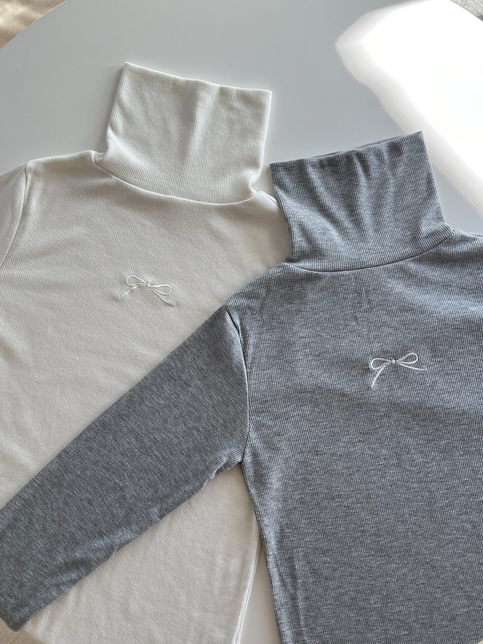 胸元のリボン刺繍がワンポイントのタートルネックニット。
